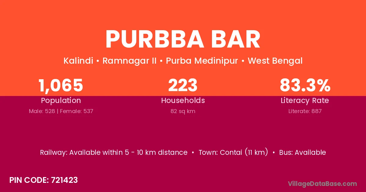 Contai (11 km) is the nearest town to Purbba Bar village for major economic activities and is located approximately 11 km away.