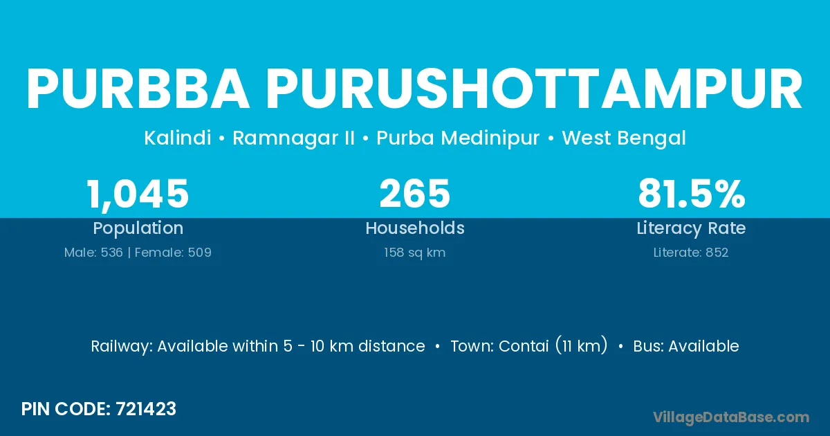 Contai (11 km) is the nearest town to Purbba Purushottampur village for major economic activities and is located approximately 11 km away.