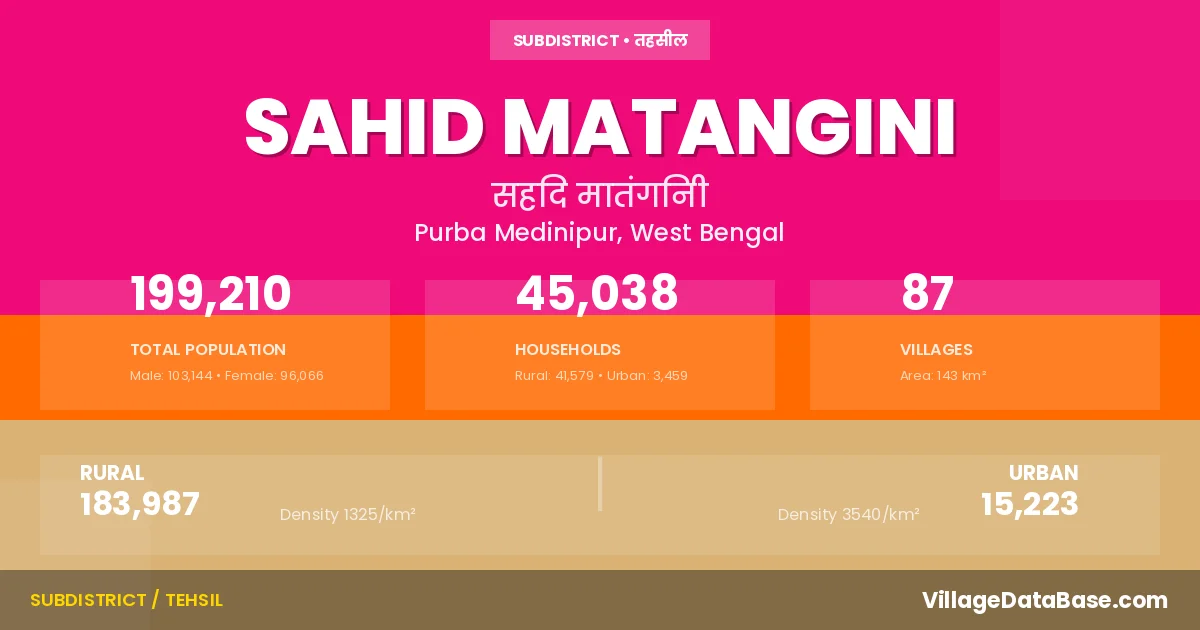 According to the 2011 census The total area of Sahid Matangini Subdivision is 143 km², with a population of 199210 people. The population density is 1,391 inhabitants per square kilometre, and there are approximately 45038 houses in the sub district.