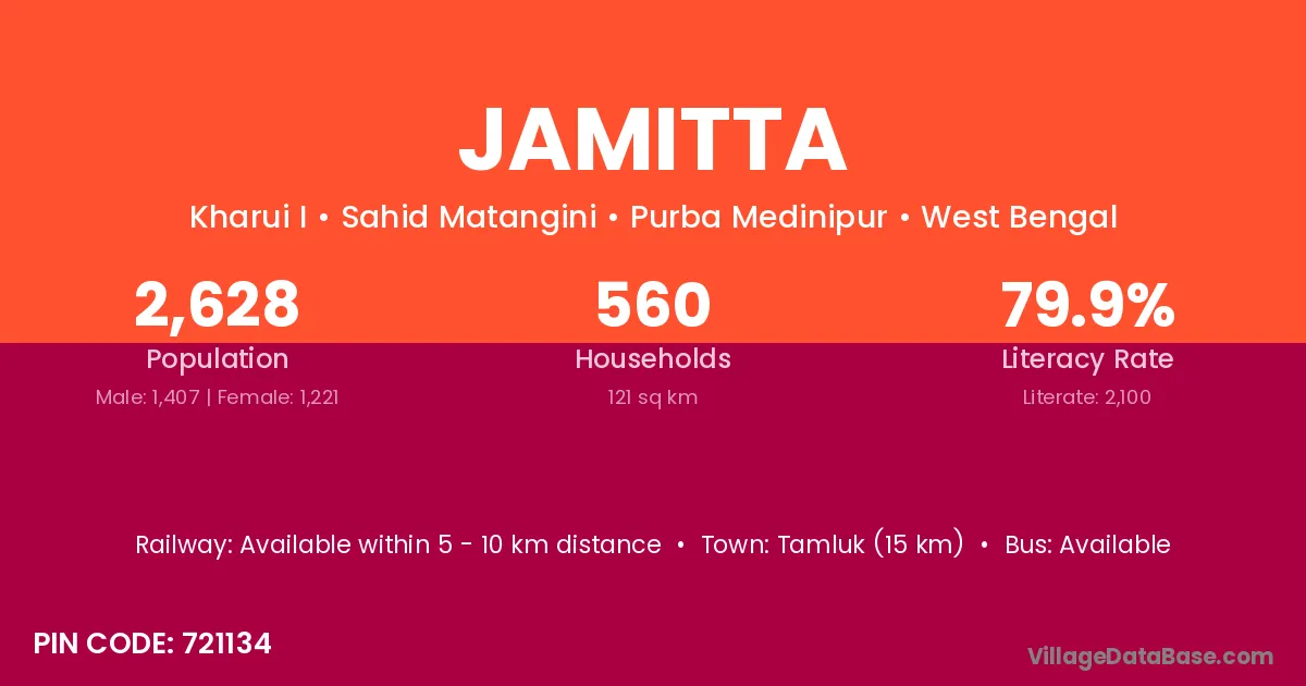 Tamluk (15 km) is the nearest town to Jamitta village for major economic activities and is located approximately 15 km away.