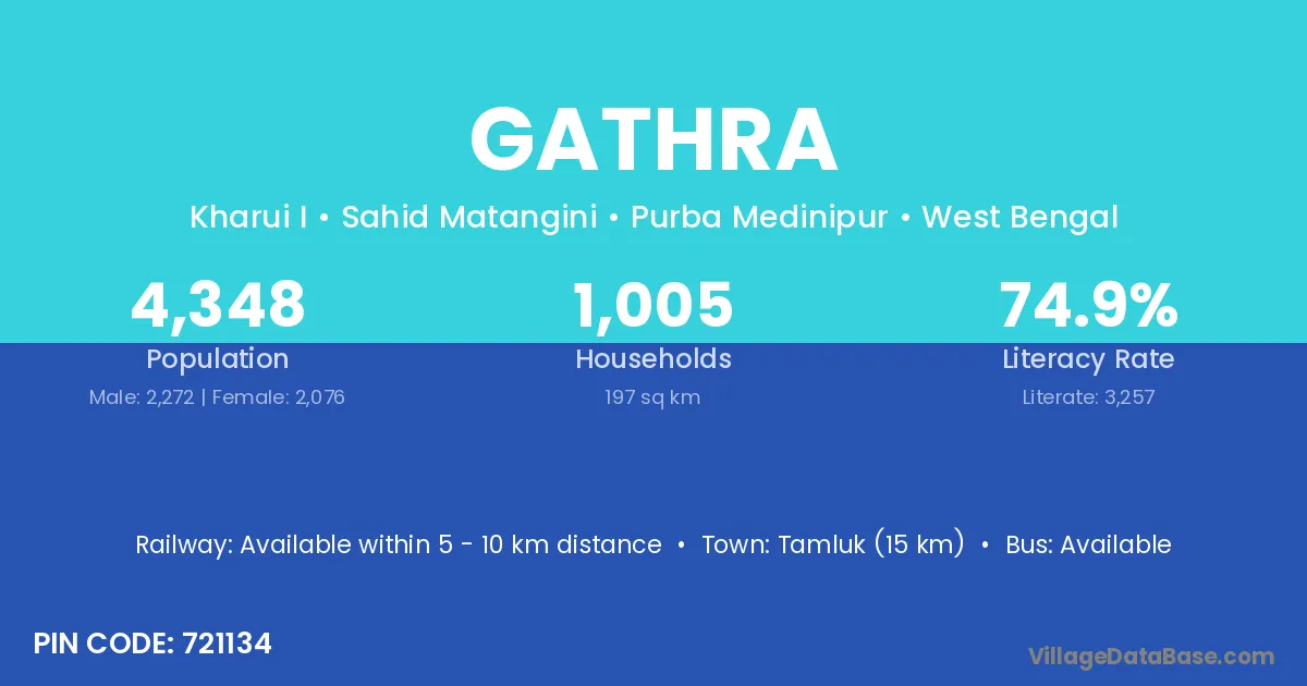 Tamluk (15 km) is the nearest town to Gathra village for major economic activities and is located approximately 15 km away.