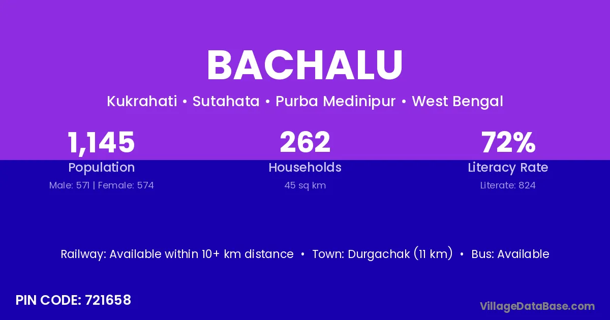 Durgachak (11 km) is the nearest town to Bachalu village for major economic activities and is located approximately 11 km away.