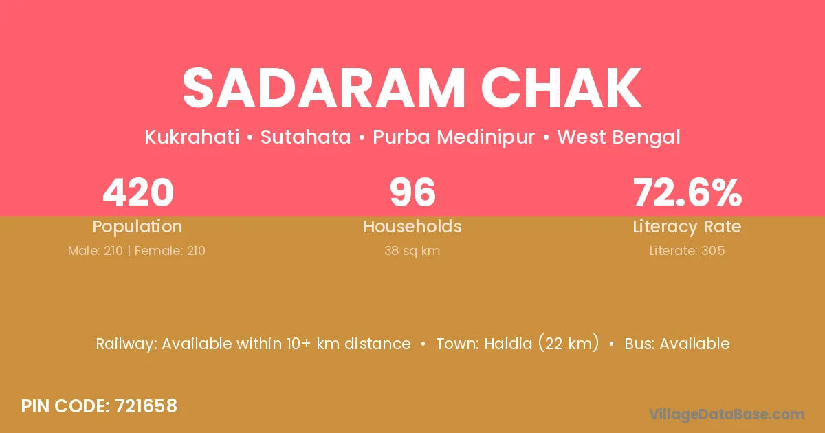Haldia (22 km) is the nearest town to Sadaram Chak village for major economic activities and is located approximately 22 km away.