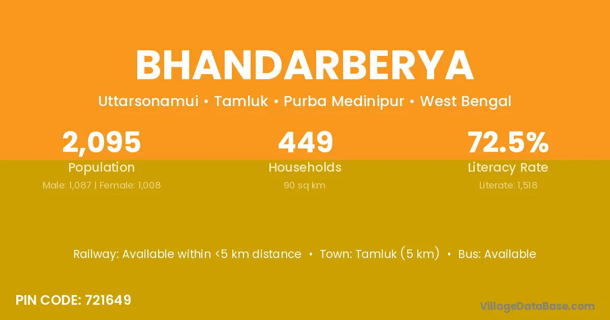 Tamluk (5 km) is the nearest town to Bhandarberya village for major economic activities and is located approximately 5 km away.
