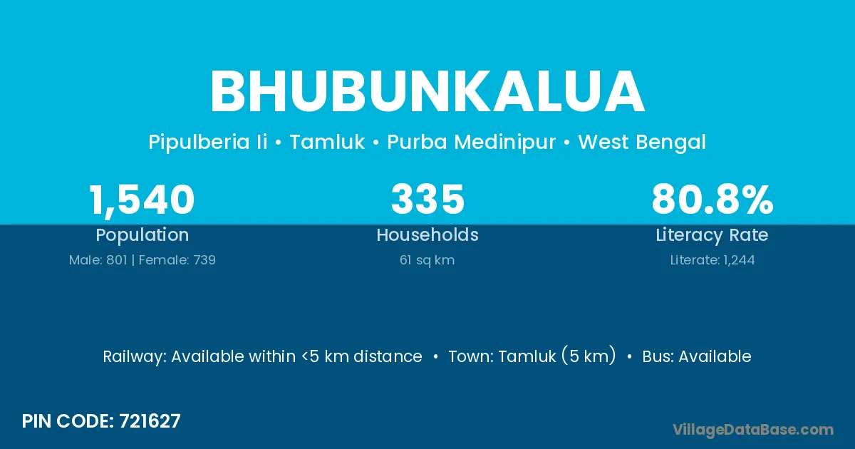 Tamluk (5 km) is the nearest town to Bhubunkalua village for major economic activities and is located approximately 5 km away.