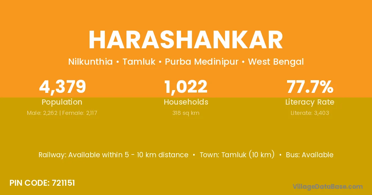 Tamluk (10 km) is the nearest town to Harashankar village for major economic activities and is located approximately 10 km away.