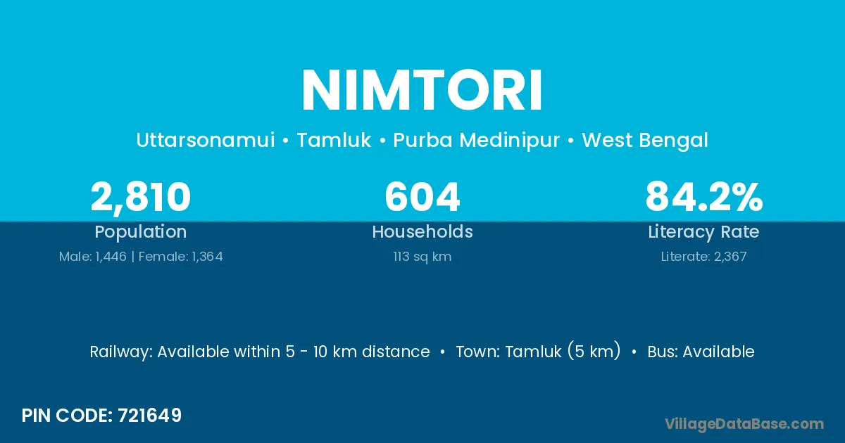 Tamluk (5 km) is the nearest town to Nimtori village for major economic activities and is located approximately 5 km away.