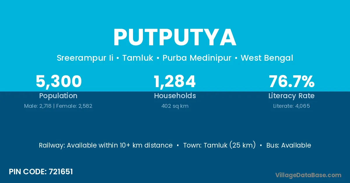 Tamluk (25 km) is the nearest town to Putputya village for major economic activities and is located approximately 25 km away.