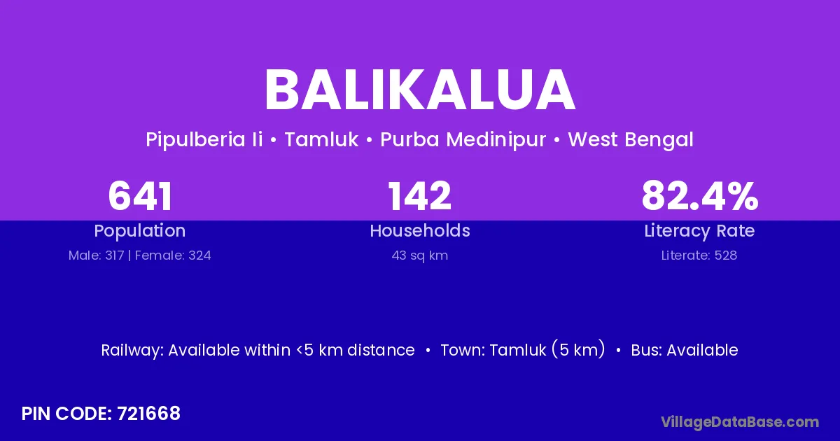 Tamluk (5 km) is the nearest town to Balikalua village for major economic activities and is located approximately 5 km away.