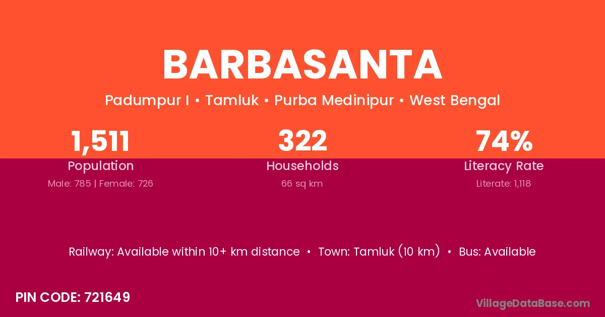 Tamluk (10 km) is the nearest town to Barbasanta village for major economic activities and is located approximately 10 km away.