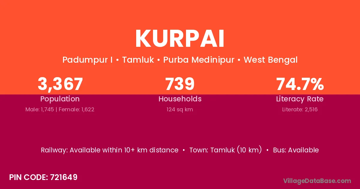Tamluk (10 km) is the nearest town to Kurpai village for major economic activities and is located approximately 10 km away.