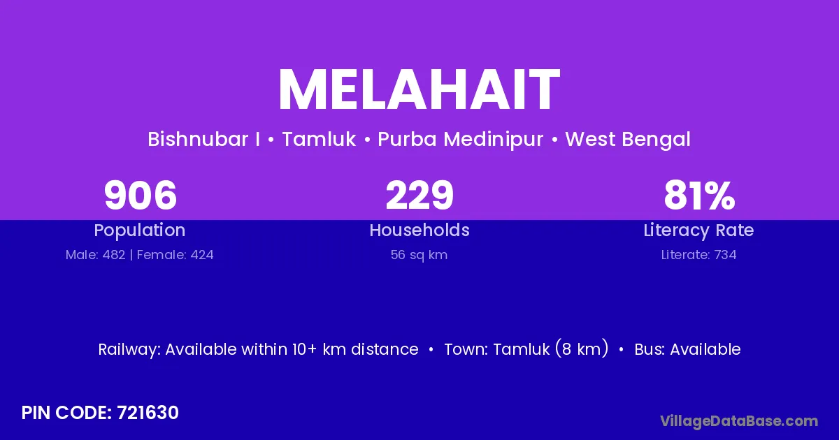 Tamluk (8 km) is the nearest town to Melahait village for major economic activities and is located approximately 8 km away.