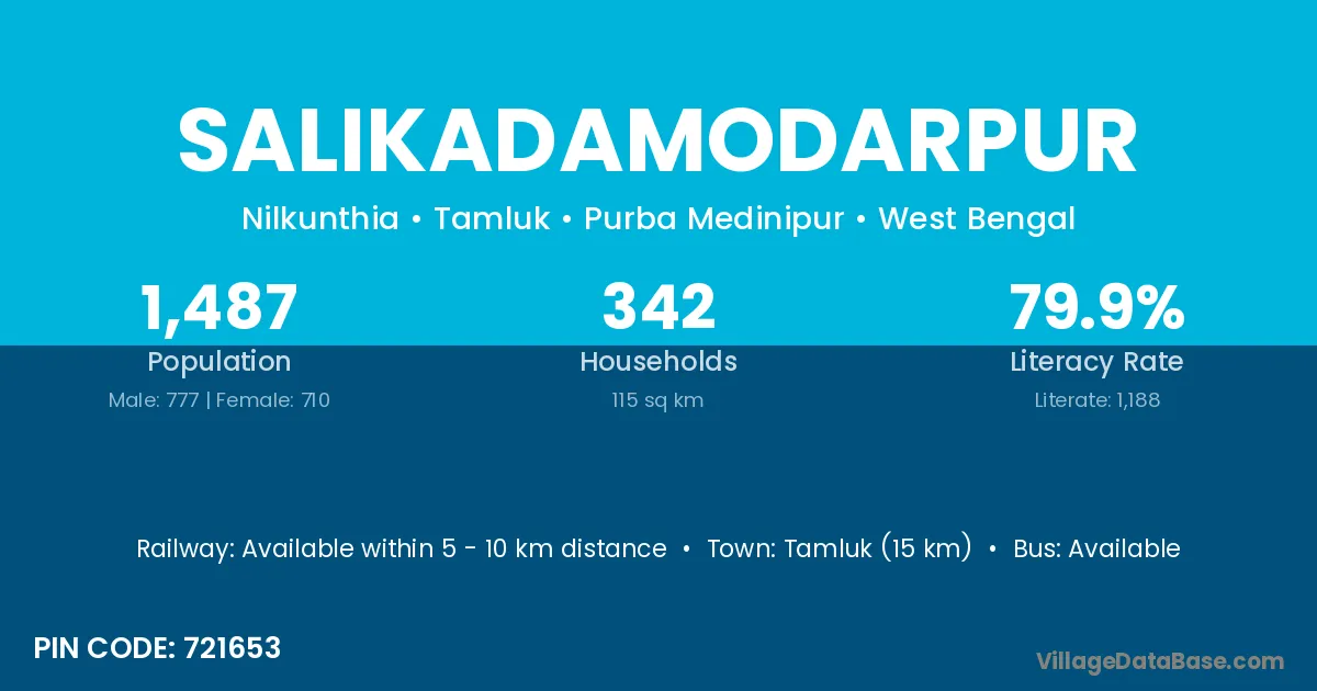 Tamluk (15 km) is the nearest town to Salikadamodarpur village for major economic activities and is located approximately 15 km away.