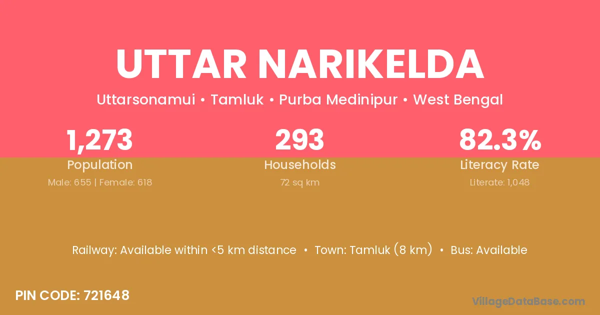 Tamluk (8 km) is the nearest town to Uttar Narikelda village for major economic activities and is located approximately 8 km away.