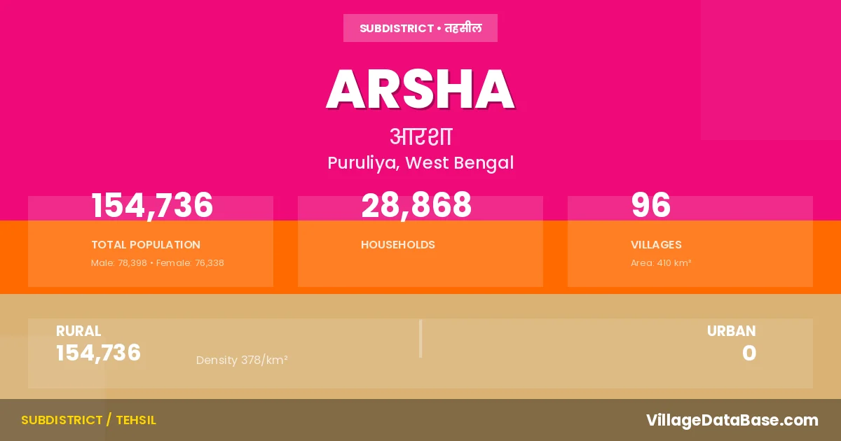 Arsha is a town and Subdivision in the Puruliya district of the West Bengal. In India, a Subdivision is a subdivision of a district responsible for the administration and revenue collection of a specific area within the district. Subdivisions play a crucial role in the local governance structure, contributing significantly to the development and administration of their communities.