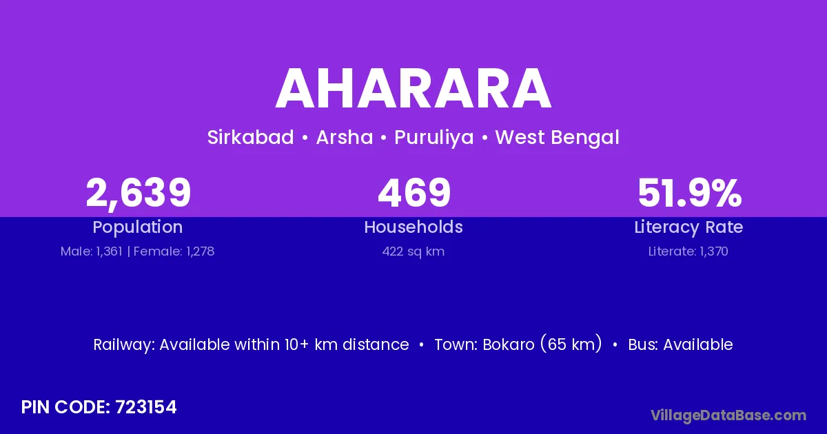 Bokaro (65 km) is the nearest town to Aharara village for major economic activities and is located approximately 65 km away.