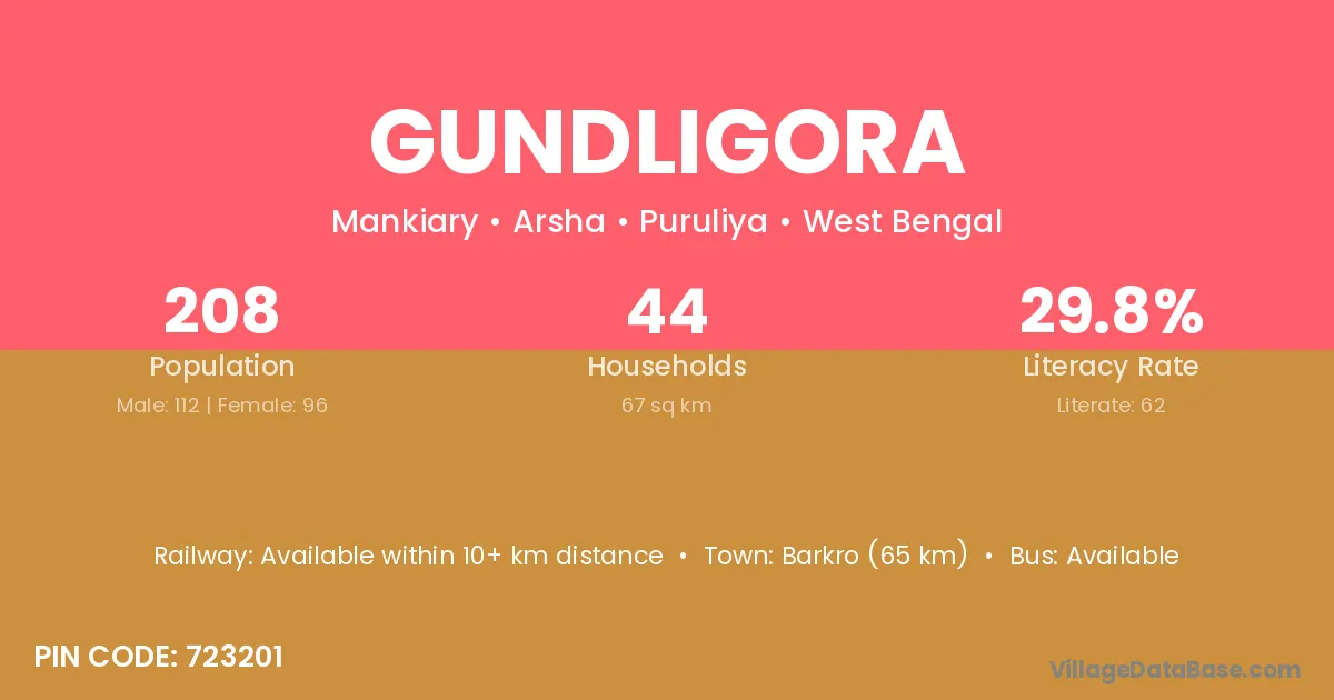 Gundligora village is located in the Arsha Subdivision of the Puruliya district in West Bengal.