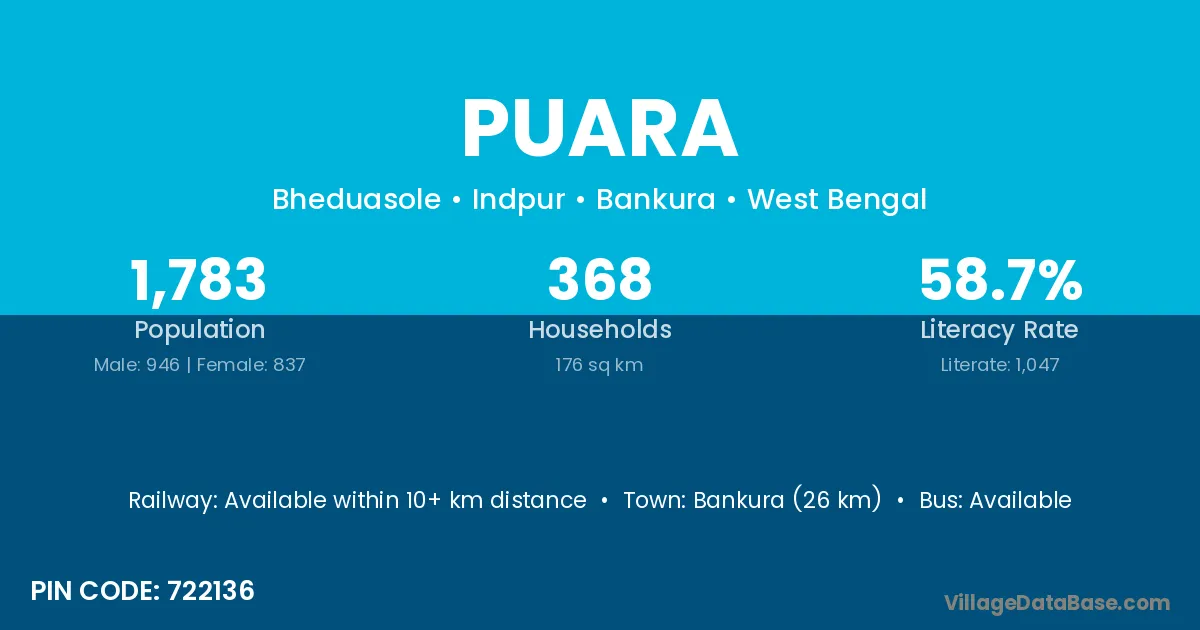 Purulia (22 km) is the nearest town to Puara village for major economic activities and is located approximately 22 km away.
