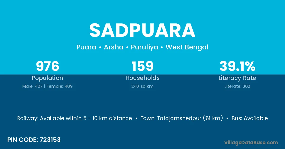 Tatajamshedpur (61 km) is the nearest town to Sadpuara village for major economic activities and is located approximately 61 km away.