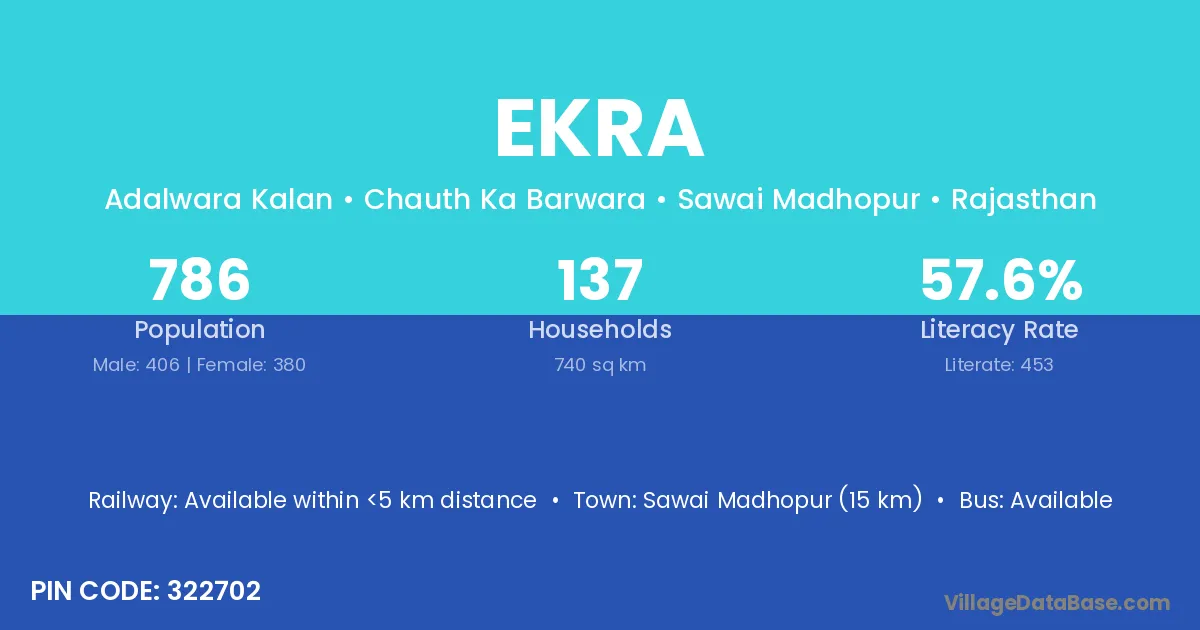 The literacy rate of Ekra village is 45.52%. Male literacy stands at 60.05% and female literacy at 29.09%.