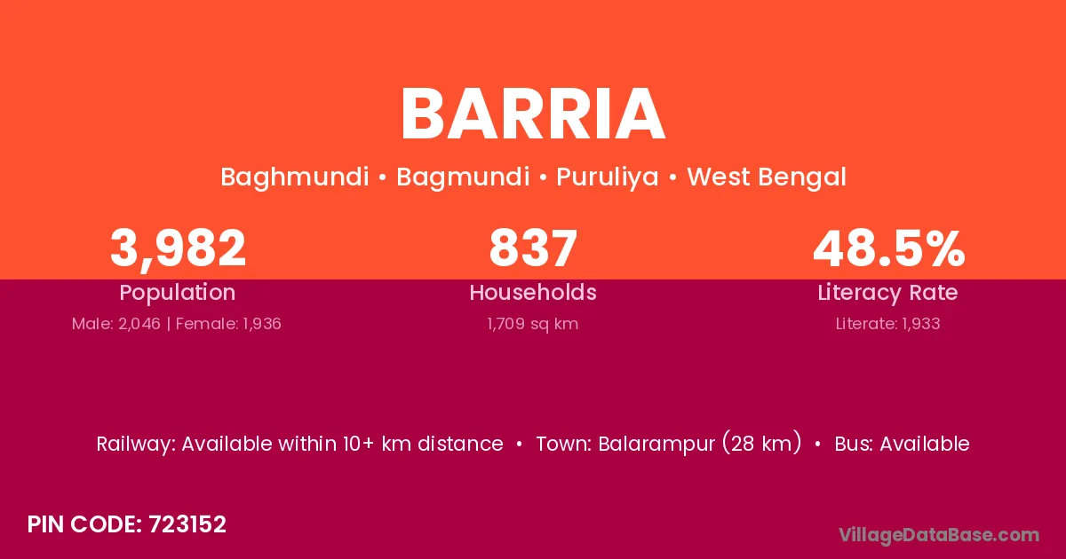Barria village is located in the Bagmundi Subdivision of the Puruliya district in West Bengal.