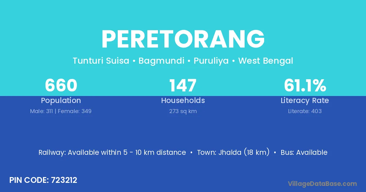 Jhalda (18 km) is the nearest town to Peretorang village for major economic activities and is located approximately 18 km away.