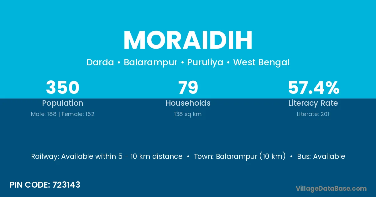 Balarampur (10 km) is the nearest town to Moraidih village for major economic activities and is located approximately 10 km away.