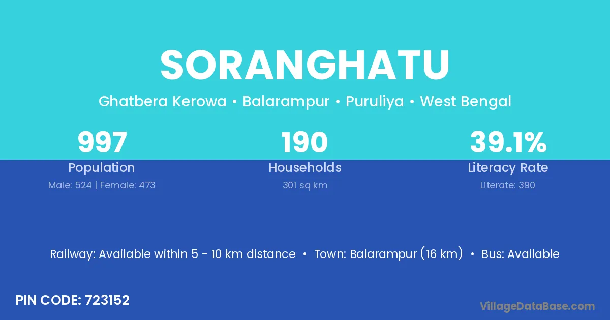 Balarampur (16 km) is the nearest town to Soranghatu village for major economic activities and is located approximately 16 km away.