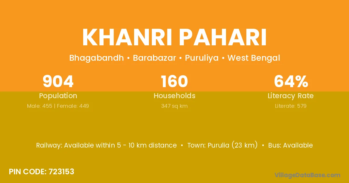 Purulia (23 km) is the nearest town to Khanri Pahari village for major economic activities and is located approximately 23 km away.