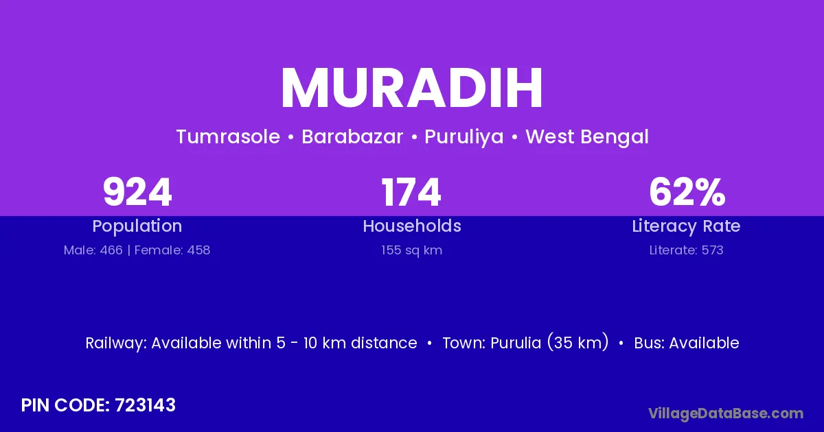 Purulia (35 km) is the nearest town to Muradih village for major economic activities and is located approximately 35 km away.