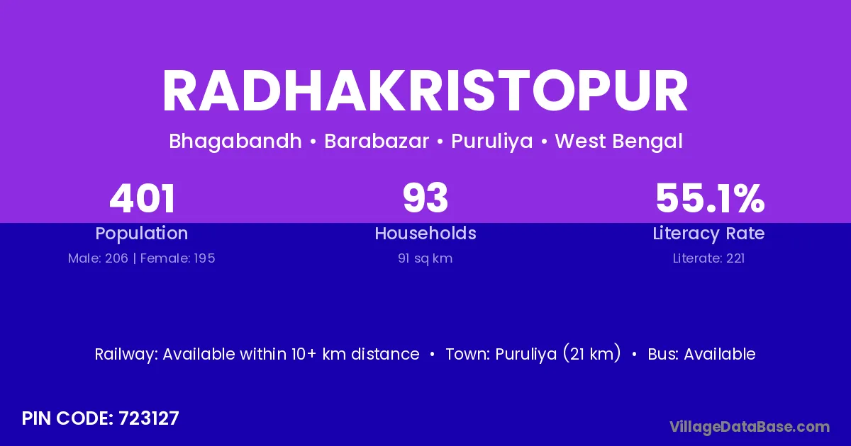Puruliya (21 km) is the nearest town to Radhakristopur village for major economic activities and is located approximately 21 km away.