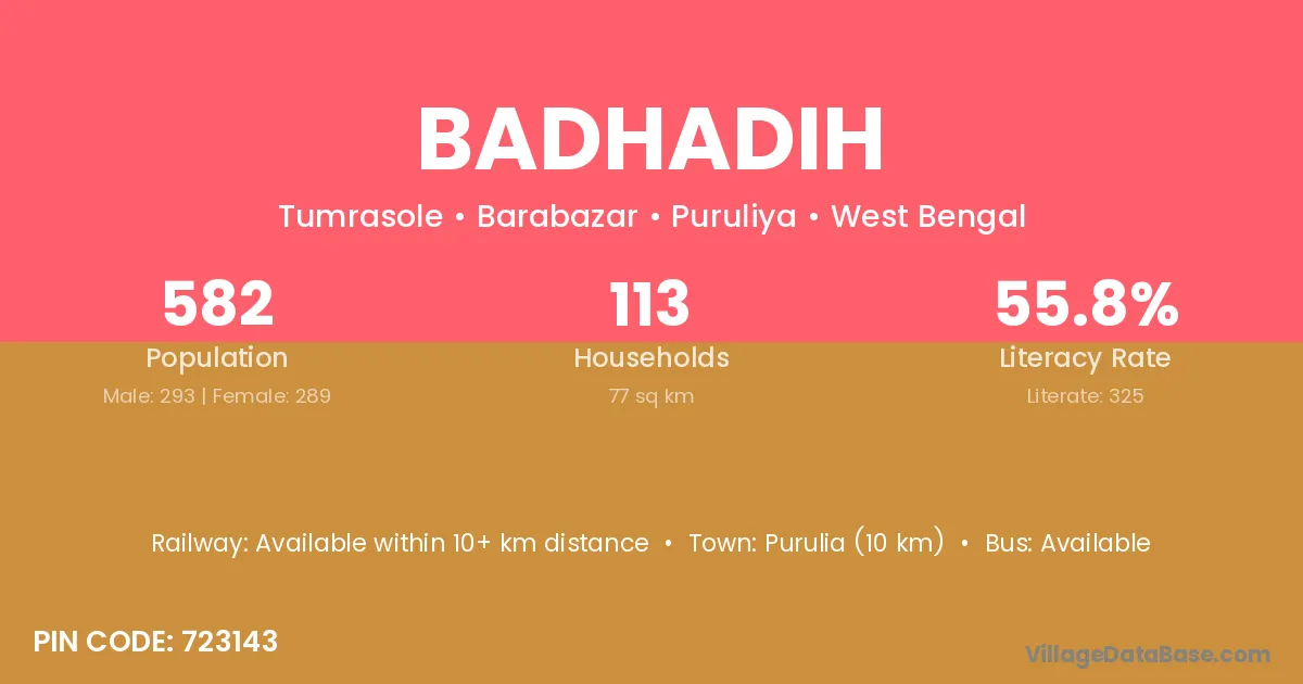 Purulia (10 km) is the nearest town to Badhadih village for major economic activities and is located approximately 10 km away.