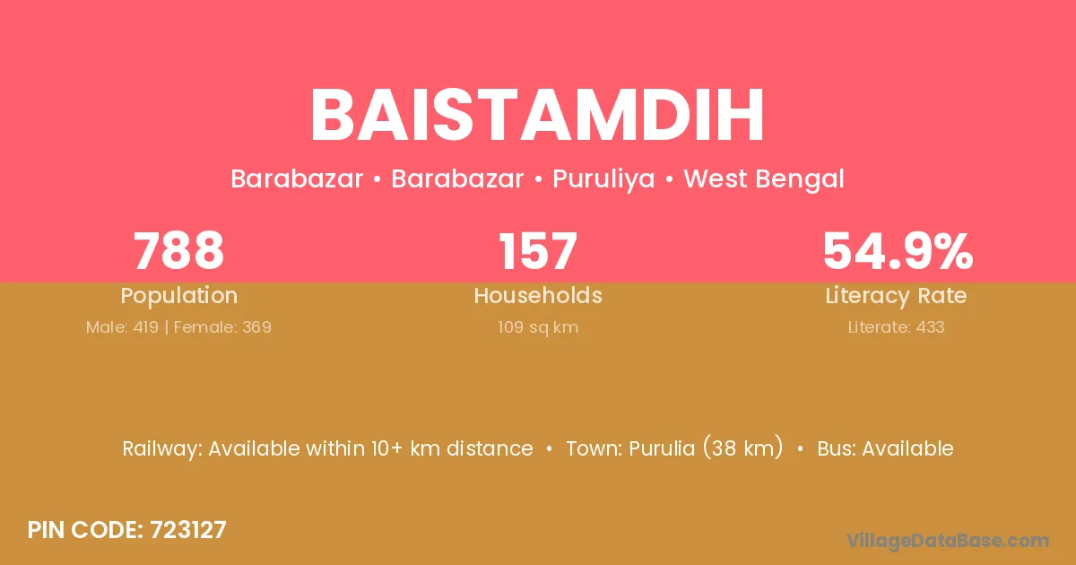 Purulia (38 km) is the nearest town to Baistamdih village for major economic activities and is located approximately 38 km away.