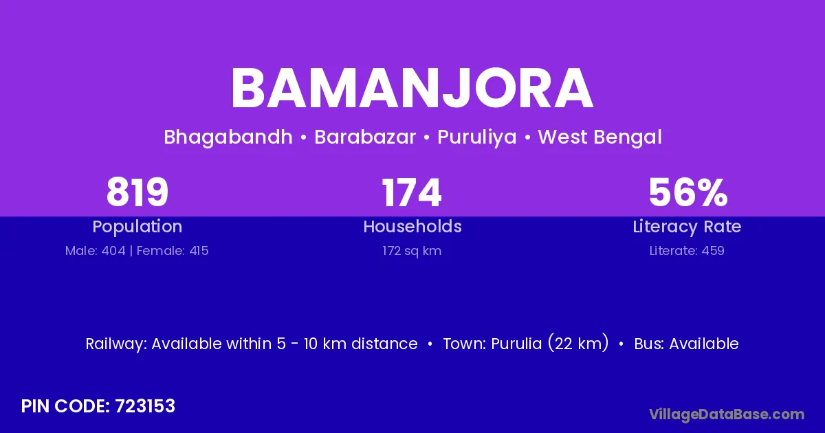 Purulia (22 km) is the nearest town to Bamanjora village for major economic activities and is located approximately 22 km away.