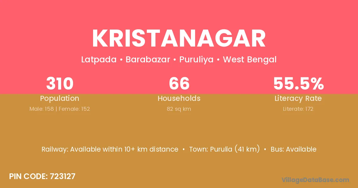Purulia (41 km) is the nearest town to Kristanagar village for major economic activities and is located approximately 41 km away.