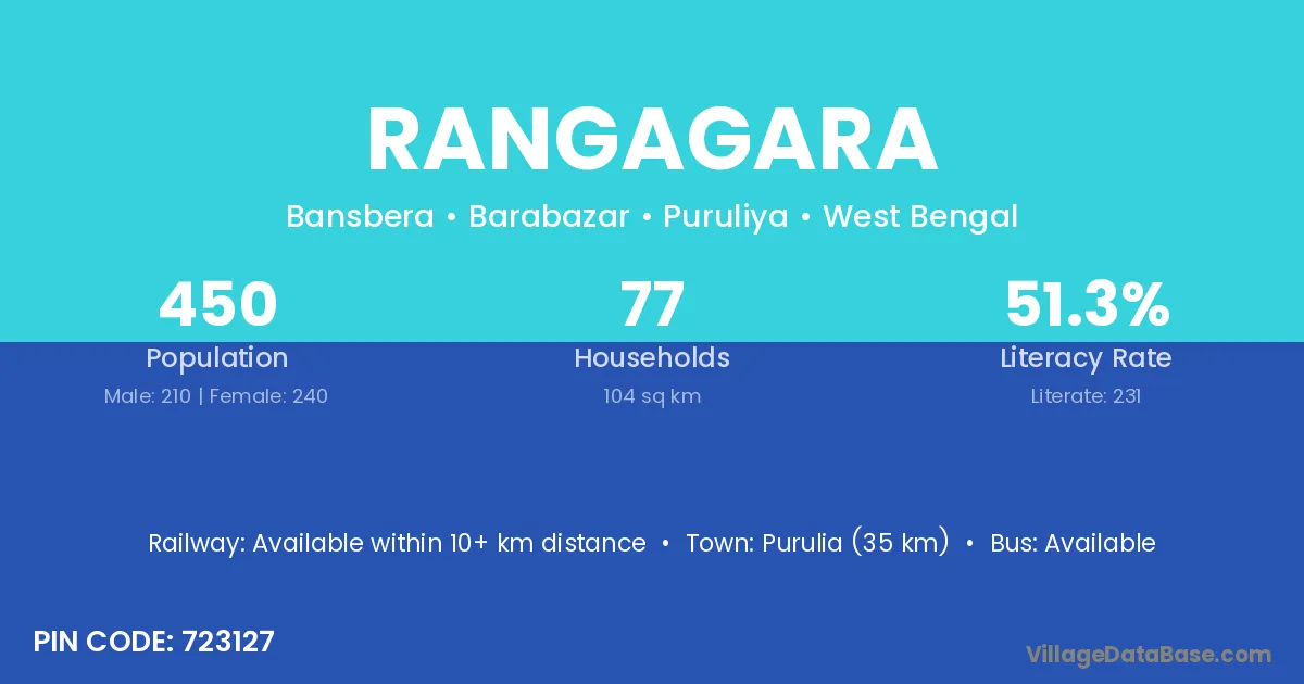 Purulia (35 km) is the nearest town to Rangagara village for major economic activities and is located approximately 35 km away.