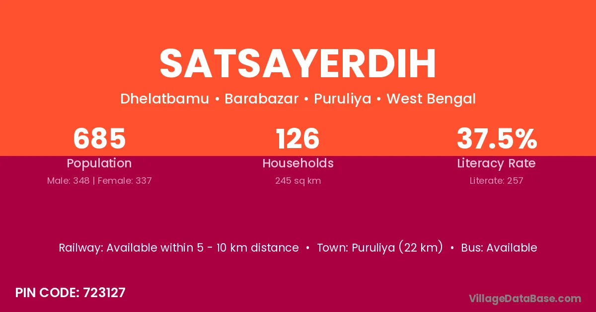 Puruliya (22 km) is the nearest town to Satsayerdih village for major economic activities and is located approximately 22 km away.