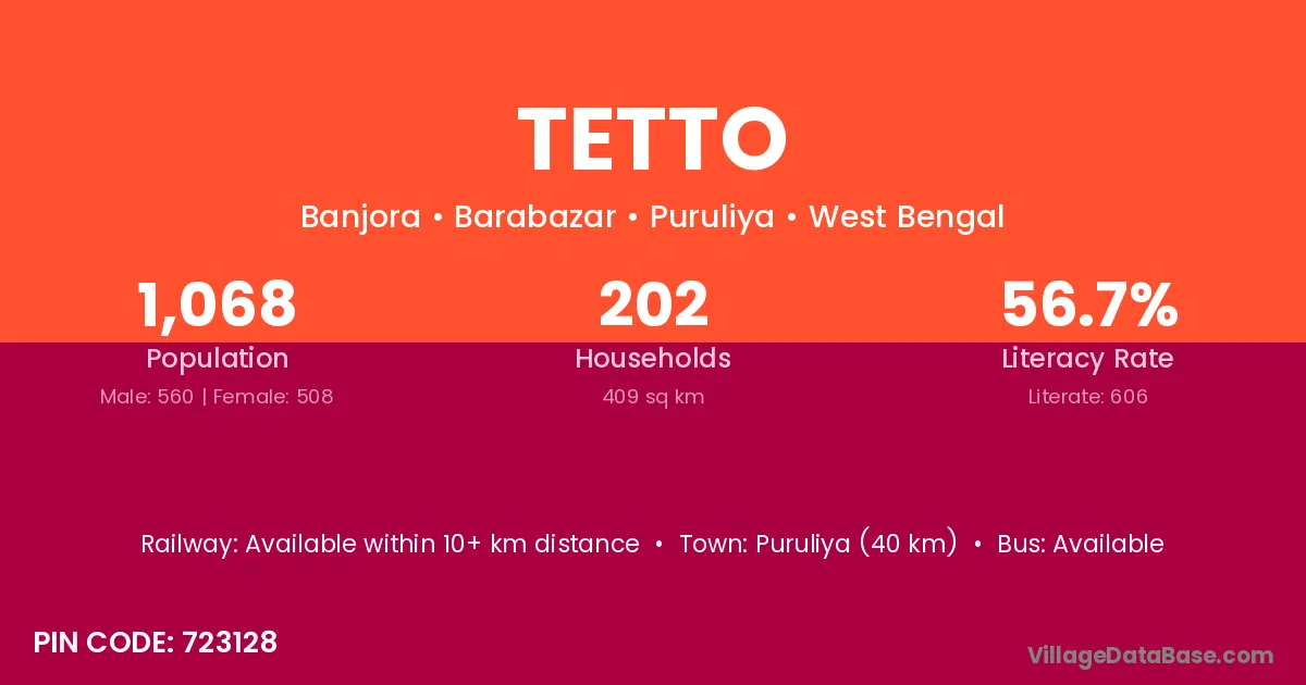 Tetto village is located in the Barabazar Subdivision of the Puruliya district in West Bengal.