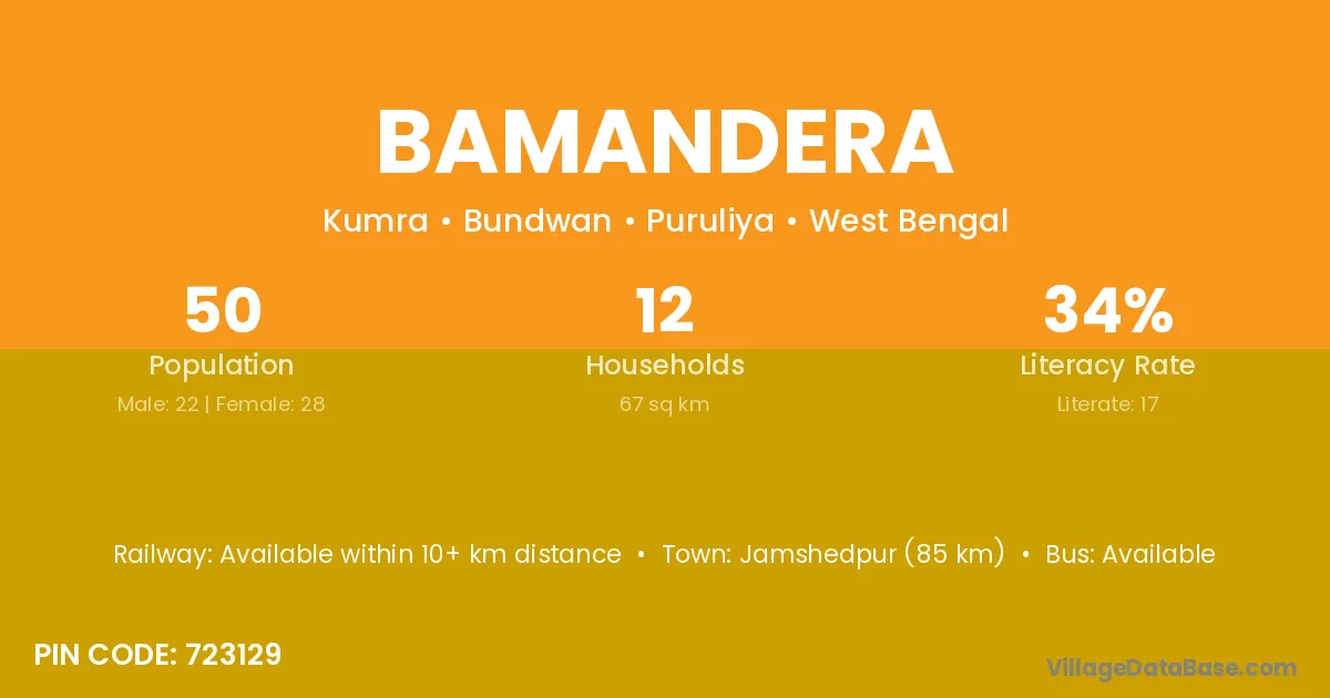 Jamshedpur (85 km) is the nearest town to Bamandera village for major economic activities and is located approximately 85 km away.