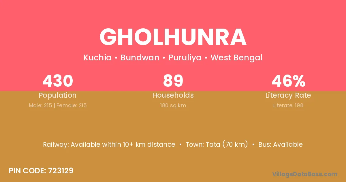 Tata (70 km) is the nearest town to Gholhunra village for major economic activities and is located approximately 70 km away.
