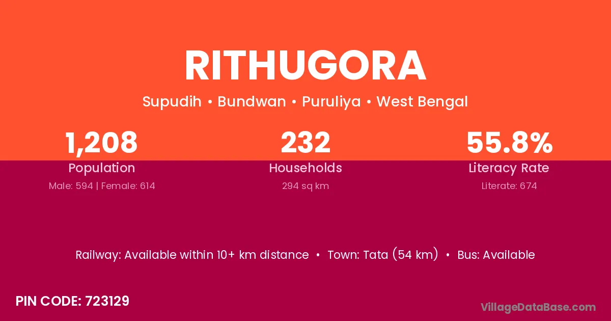 Tata (54 km) is the nearest town to Rithugora village for major economic activities and is located approximately 54 km away.