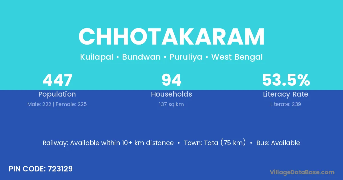 Tata (75 km) is the nearest town to Chhotakaram village for major economic activities and is located approximately 75 km away.