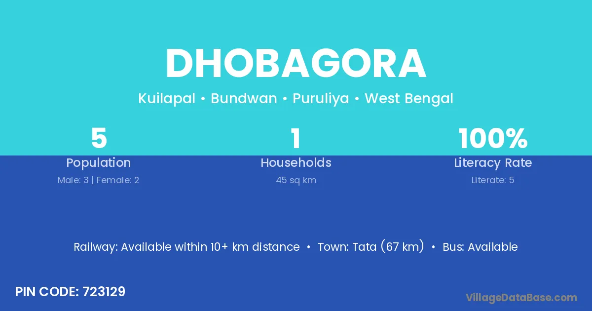 Tata (67 km) is the nearest town to Dhobagora village for major economic activities and is located approximately 67 km away.