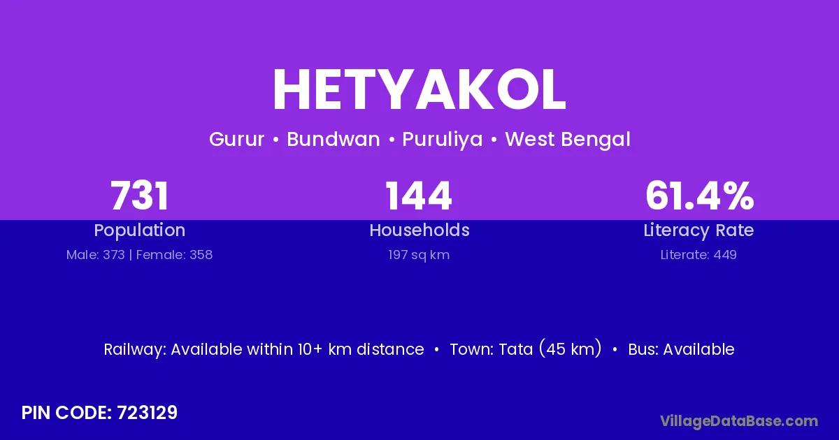 According to Census 2011 information, the village code of Hetyakol village is 723129.