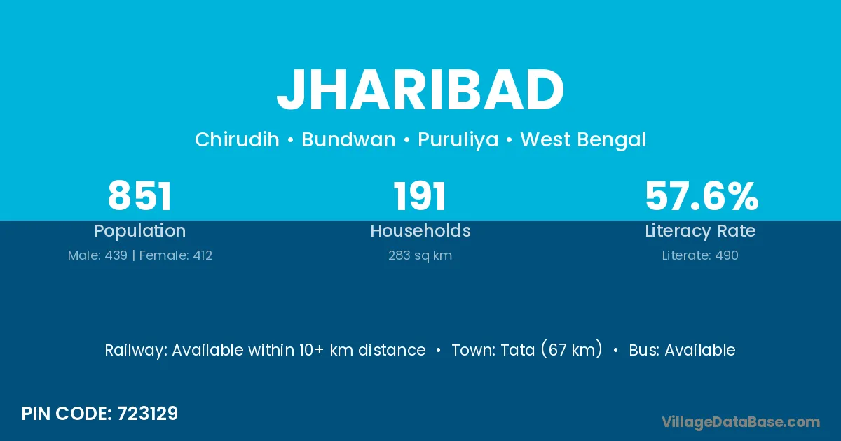 Tata (67 km) is the nearest town to Jharibad village for major economic activities and is located approximately 67 km away.