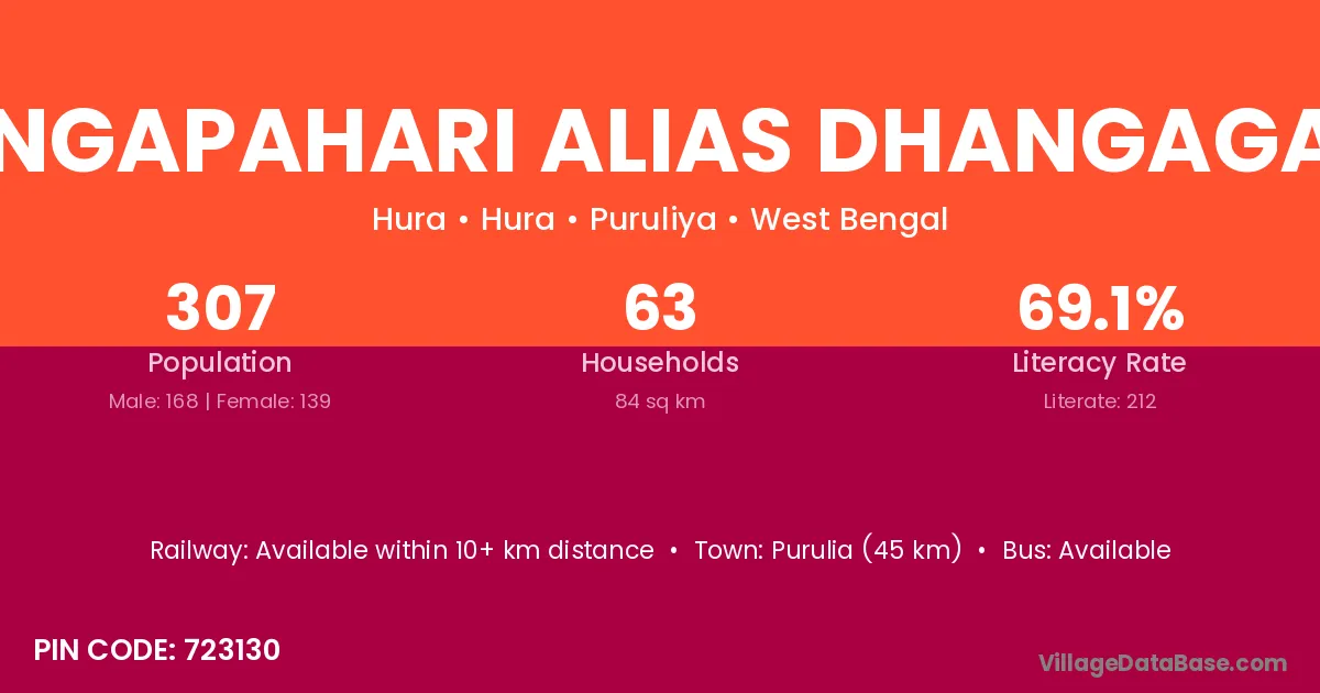 Purulia (45 km) is the nearest town to Dangapahari Alias Dhangagara village for major economic activities and is located approximately 45 km away.