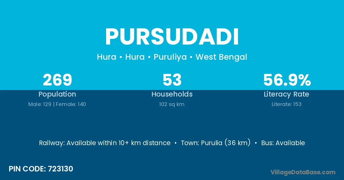 Purulia (36 km) is the nearest town to Pursudadi village for major economic activities and is located approximately 36 km away.