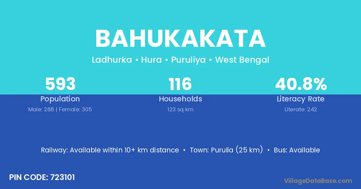 Purulia (25 km) is the nearest town to Bahukakata village for major economic activities and is located approximately 25 km away.