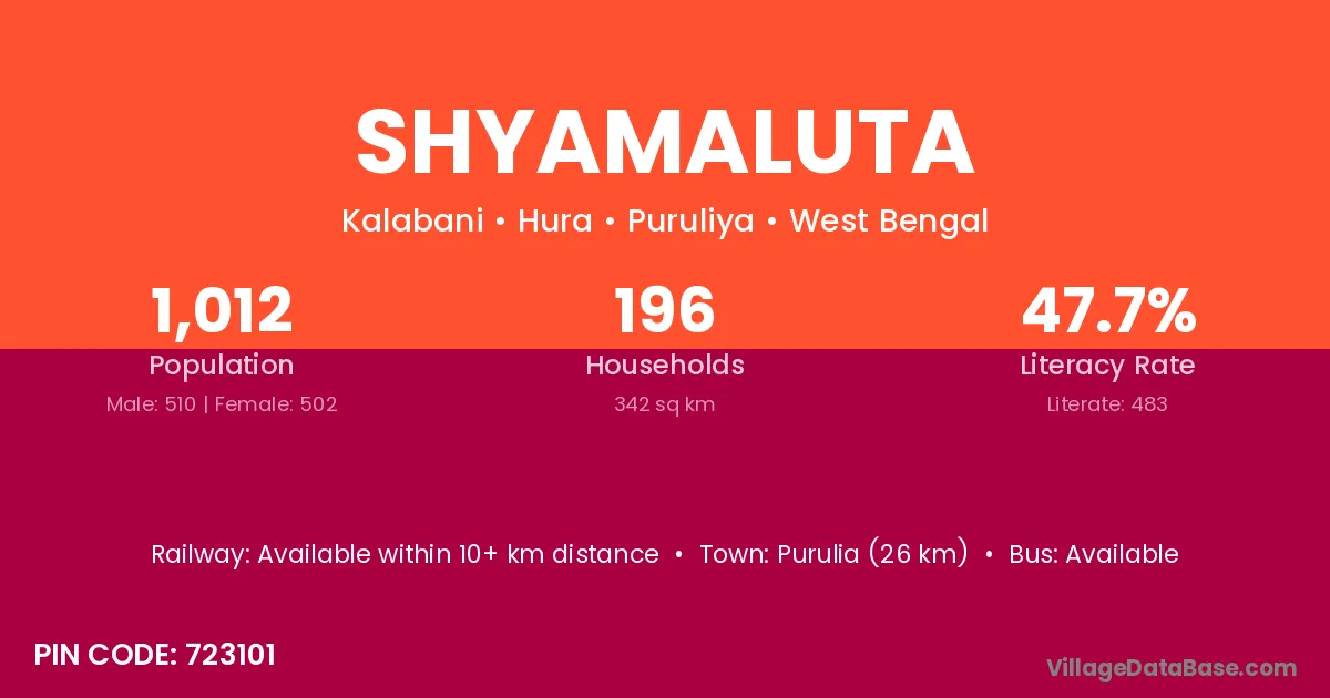 Purulia (26 km) is the nearest town to Shyamaluta village for major economic activities and is located approximately 26 km away.