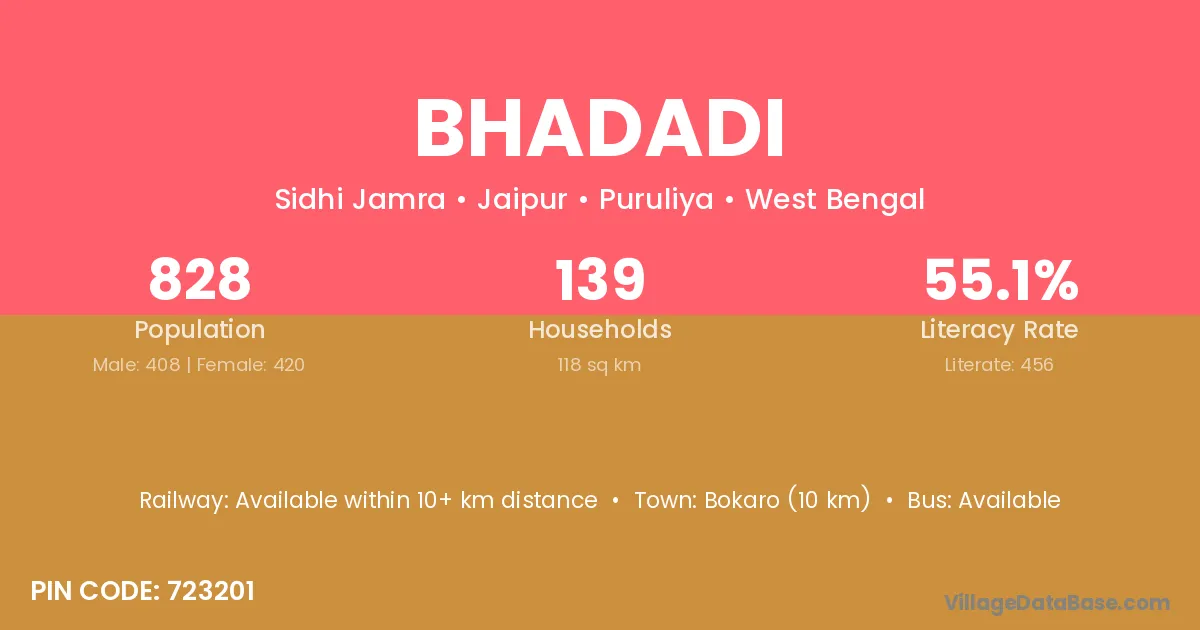 Bokaro (10 km) is the nearest town to Bhadadi village for major economic activities and is located approximately 10 km away.